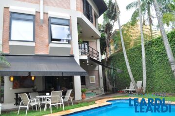 Construída nos anos 70 e atualizada por Conrado Ceravolo, a casa ganhou novo ritmo sem perder suas raízes. O térreo abriga living com pé-direito duplo, cozinha integrada, lavabo e um escritório funcional. O cimentício contrasta com a leveza do paisagismo assinado por Claudia Diamant, que emoldura a casa com verde. Visitas agendadas.